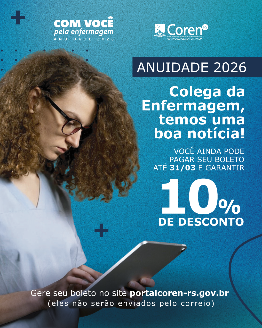 Até 31 de março é possível pagar a anuidade 2026 do Coren-RS com desconto de 10% para quem quitar o valor à vista! Esse percentual é válido exclusivamente para o pagamento até esta data. Se o boleto não for pago até 31 de março, o desconto de 10% deixa de valer, ok?