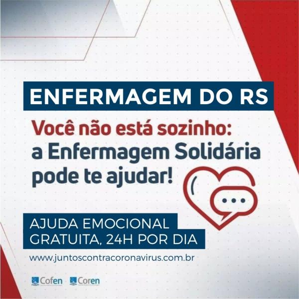 Profissionais de Enfermagem do Rio Grande do Sul podem, a partir desta sexta-feira, dia 26 de fevereiro, buscar apoio em saúde mental no programa Enfermagem Solidária. A iniciativa, criada em 2020 por conta da pandemia do novo Coronavírus, por mobilização do Conselho Federal de Enfermagem (Cofen) e dos conselhos regionais, tem profissionais de Enfermagem especializadas(os) em Saúde Mental voluntárias(os) para o atendimento às(aos) colegas.